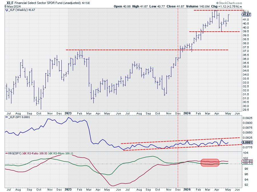 At the dashed vertical line, both RRG-Lines had crossed above the 100-level, pushing the XLF tail into the leading quadrant on the RRG.