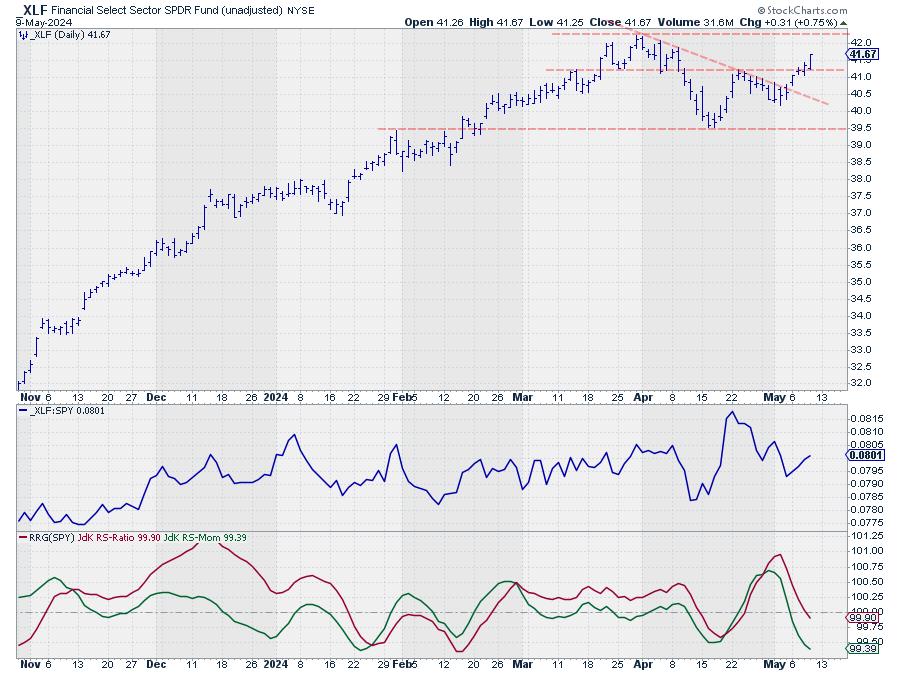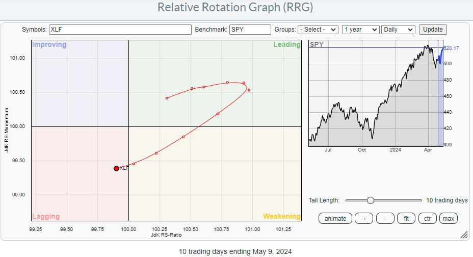 The setback off of that all-time high has caused relative strength to correct slightly, causing the (daily) RRG-Lines to dip below 100 and push the XLF tail into lagging on the daily RRG.