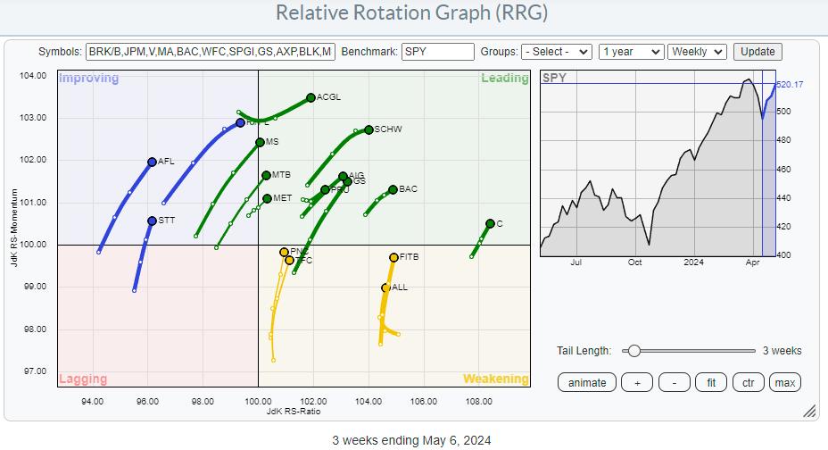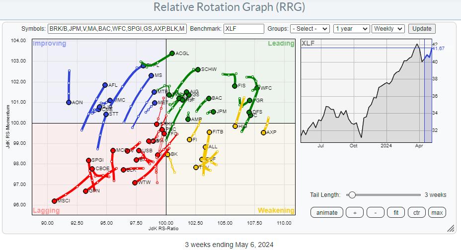 The RRG for individual stocks inside the financials sector shows an evenly distributed universe around the (XLF) benchmark.