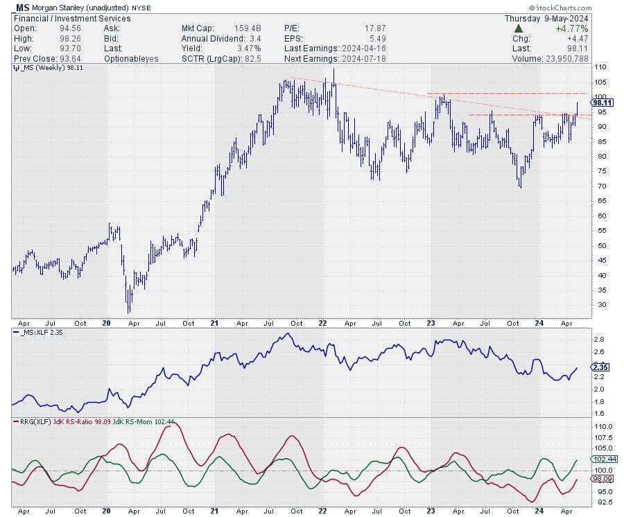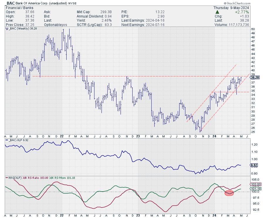 BAC is also close to breaking overhead resistance, after which there is plenty of upside. Relative strength is coming out of a long downtrend that started early in 2022, making this a major reversal.