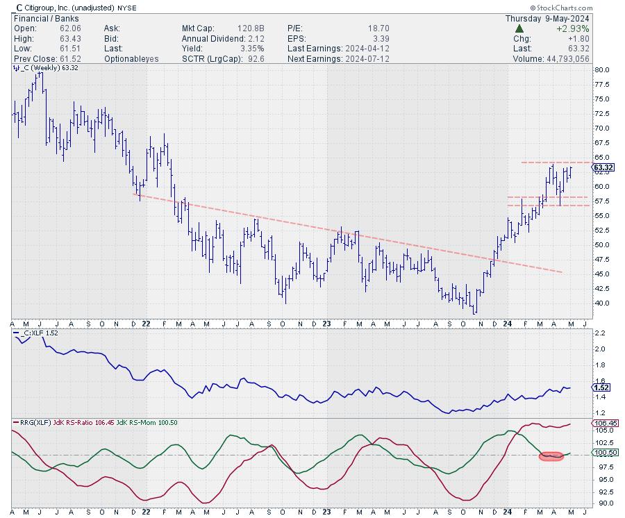 Citigroup is still trading below its previous high. However, given the recently formed higher low and the strong rally out of it, an upward break is likely. Such a break is supported by the recent relative rotation back into leading from weakening.