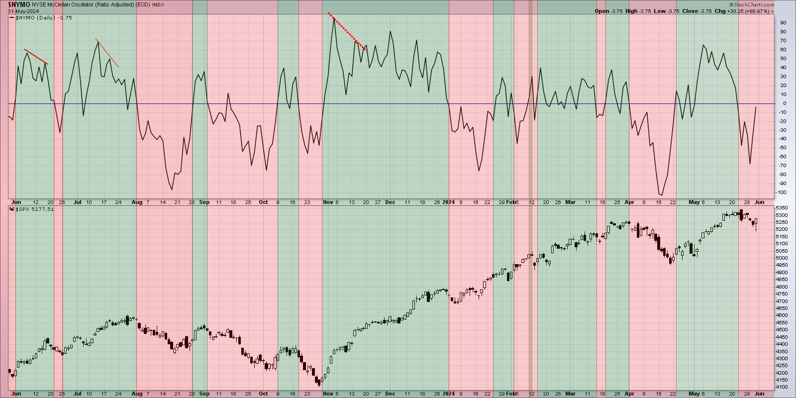 I’ve color-coded this chart green to highlight positive breadth and red for negative breadth conditions over the past 12 months. Note how we recently rotated back below the zero level, providing the final piece of evidence for an initial reading on the Hindenburg Omen.