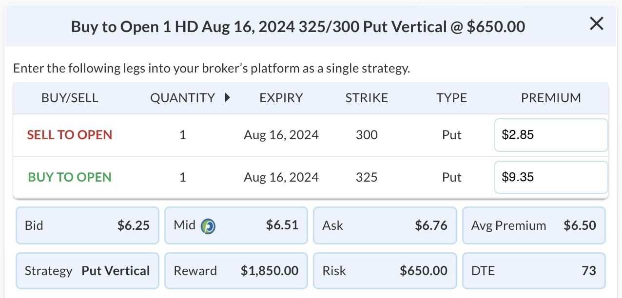 FIGURE 2. EXAMPLE OF A PUT VERTICAL SPREAD OPTIONS TRADE FOR HD.