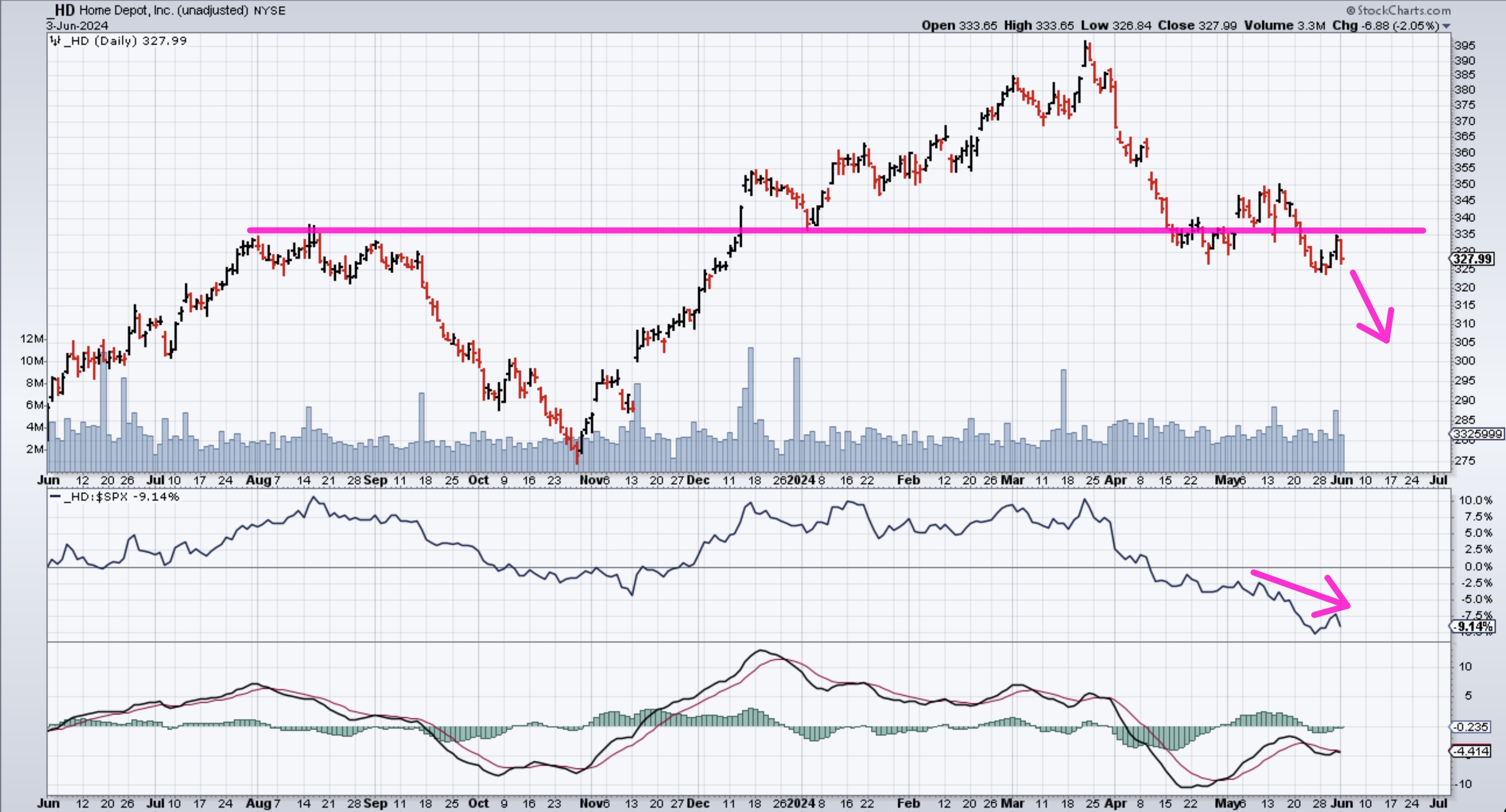 America’s largest home improvement store, Home Depot, Inc. (HD), has benefited from a long period of investor interest and traded at a premium valuation for several years. However, the recent environment of slowing consumer spending and higher interest rates has finally caught up with HD; the risks are to the downside, below $300.