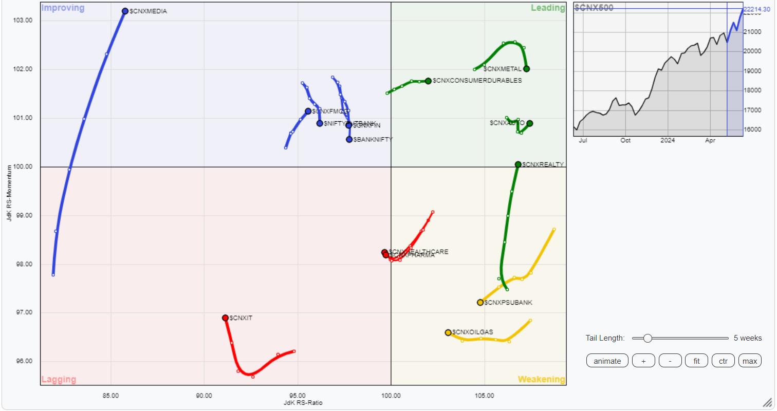 In our look at Relative Rotation Graphs®, we compared various sectors against CNX500 (NIFTY 500 Index), which represents over 95% of the free float market cap of all the stocks listed.