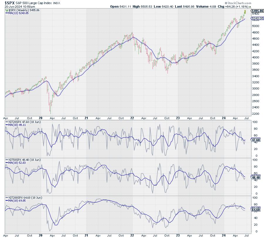 Other metrics to measure market breadth and participation are indicators that track the percentage of stocks above a moving average. At StockCharts.com, we track these percentages for the major indices and sectors for 20-, 50-, and 200-day exponential moving averages.