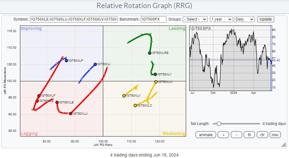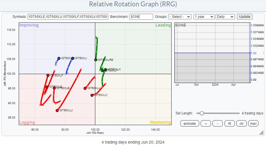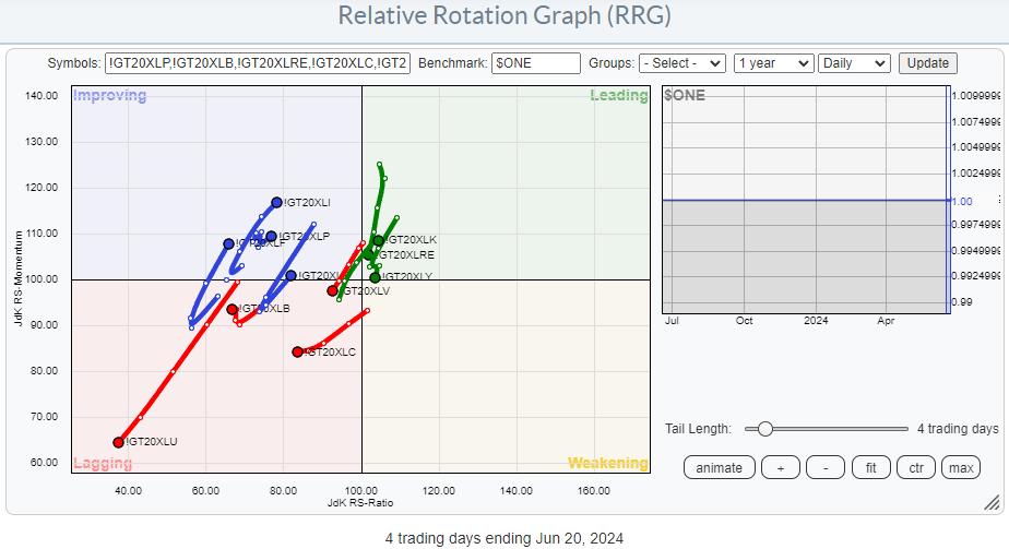 However, as we have these indicators for the individual sectors, we can also plot them on a Relative Rotation Graph.