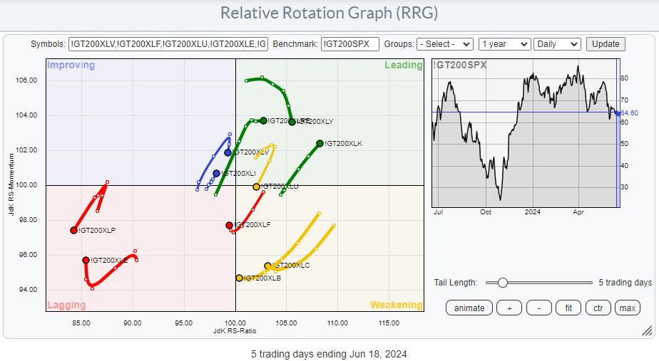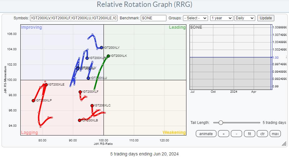 On the 200-day version, we find quite a few tails still on the right-hand side of the graph, but most have rolled over and/or turned to a negative RRG-Heading. Only !GT200XLK is still at a strong heading and moving further into the leading quadrant.
