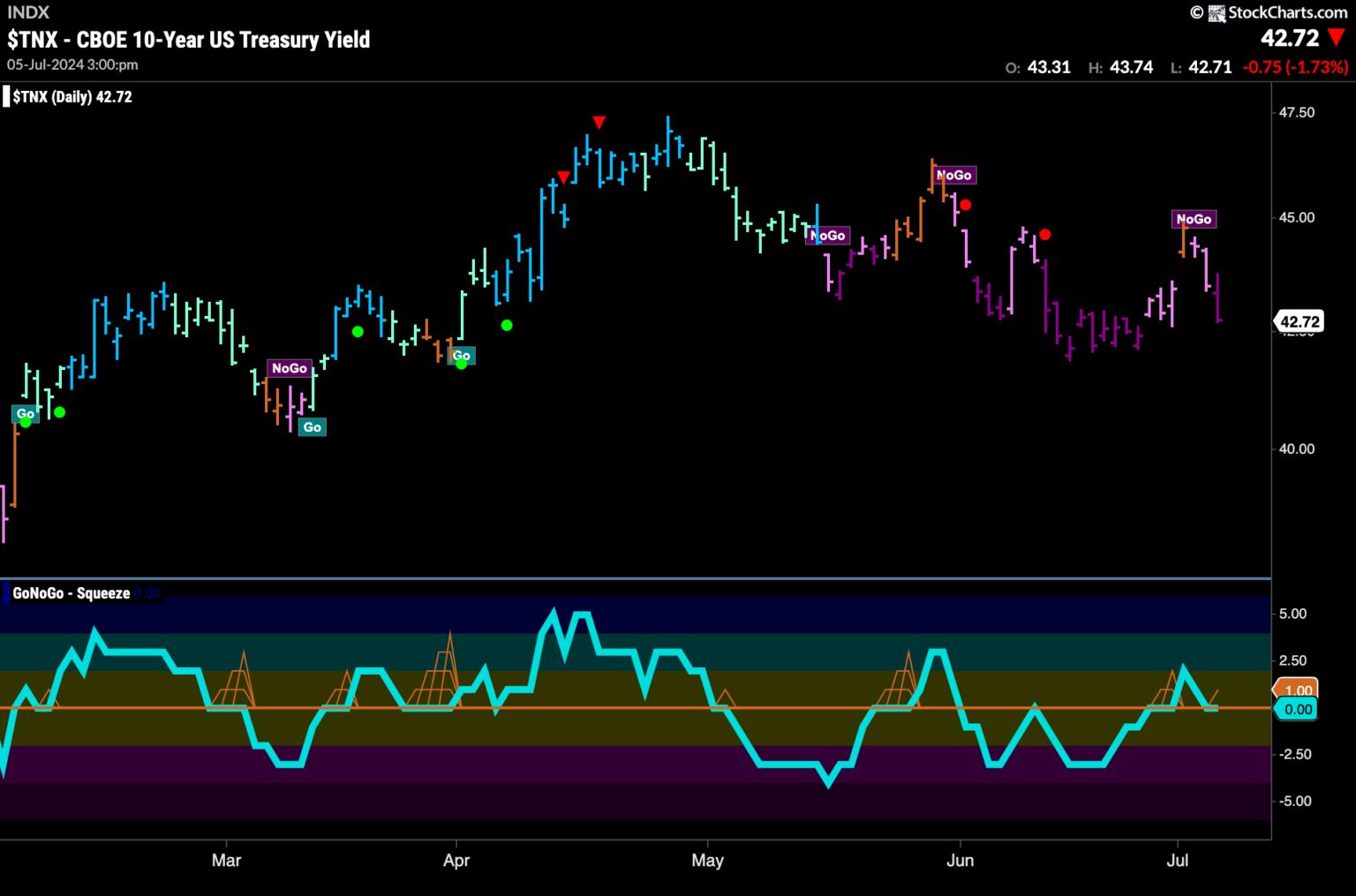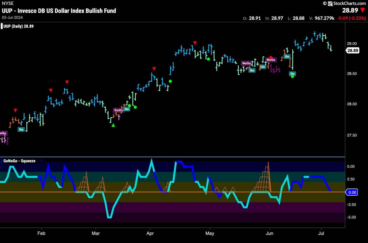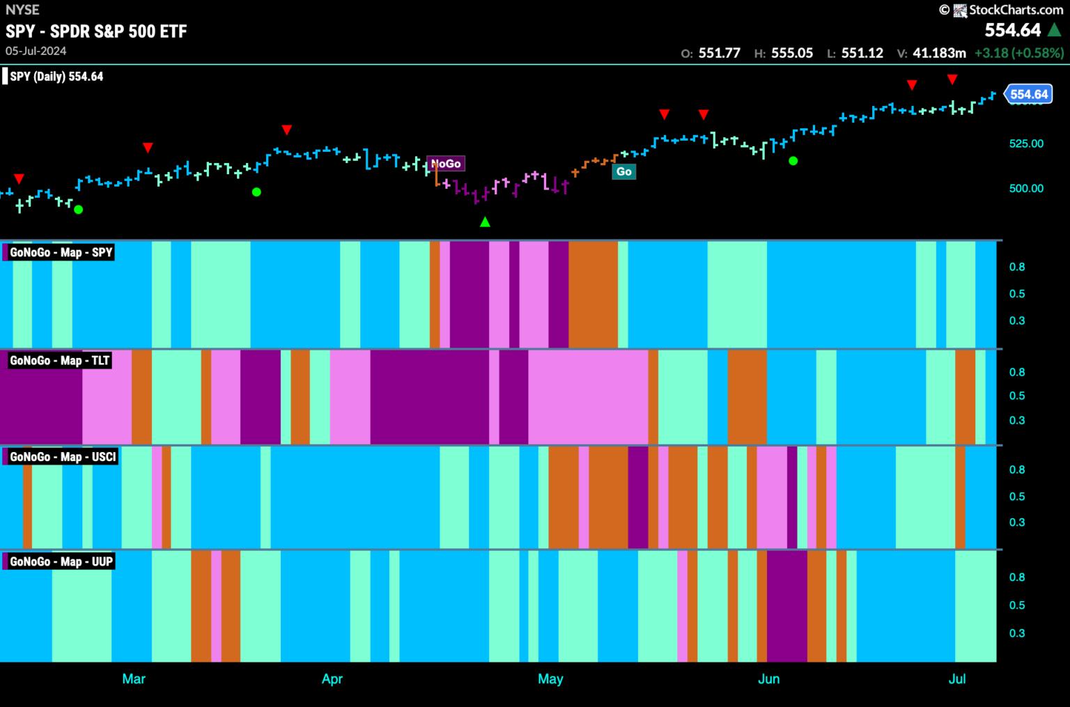 Treasury rates jumped higher earlier in the week and it was enough to make GoNoGo Trend paint an amber “Go Fish” bar. However, the “NoGo” returned as the week finished with first pink and then a strong purple bar. GoNoGo Oscillator which had broken into positive territory has quickly returned to test the zero line from above. It will be important to see if this level now offers support.