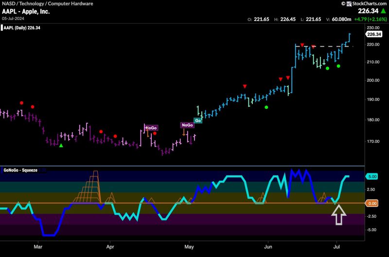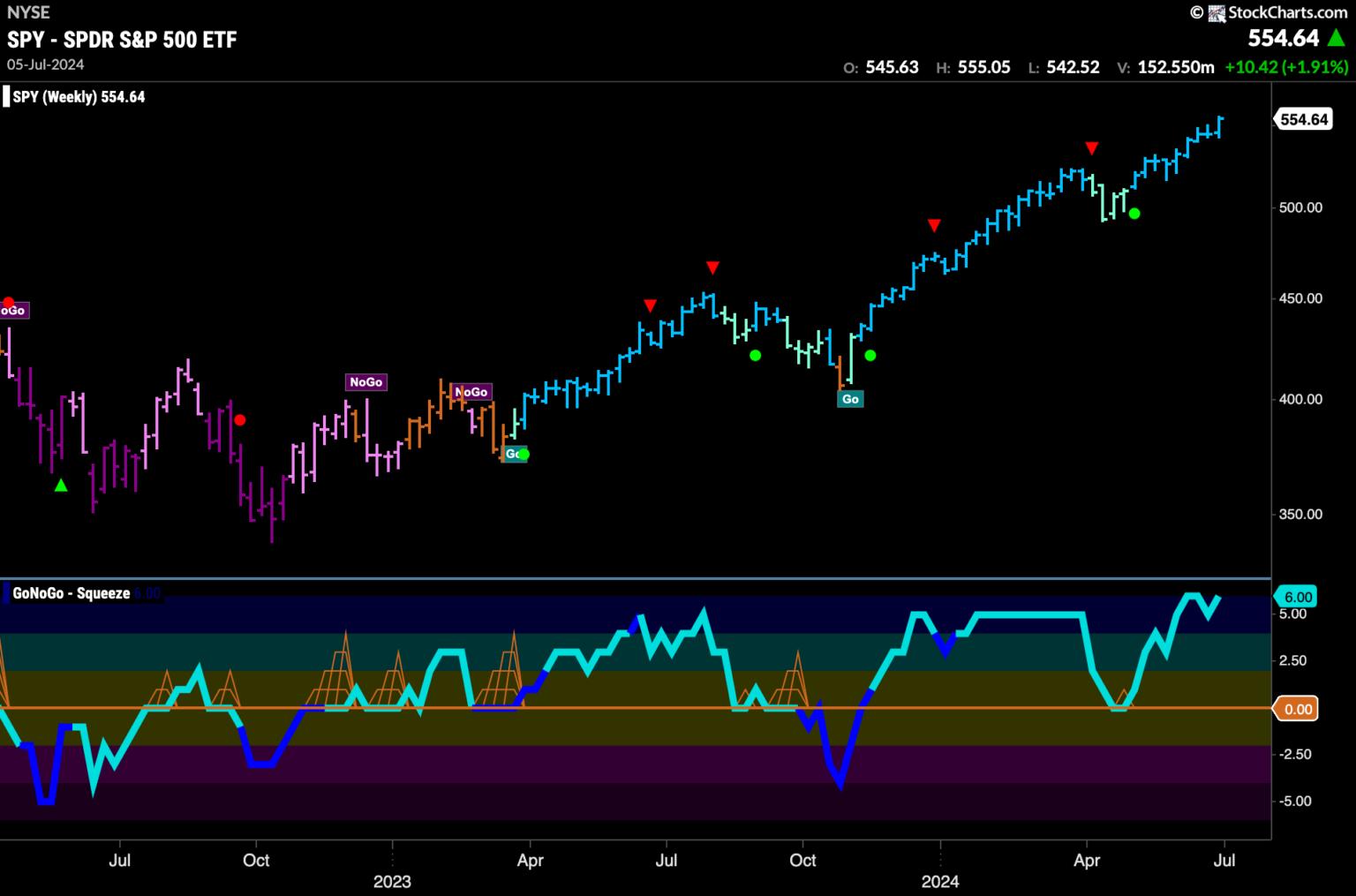 Another higher weekly close tells us that the “Go” trend remains strong on the larger timeframe. We now have seen 9 consecutive strong blue “Go” bars since the period of weakness in April. GoNoGo Oscillator stays overbought for another week which tells us how enthusiastic the market is as price soars.