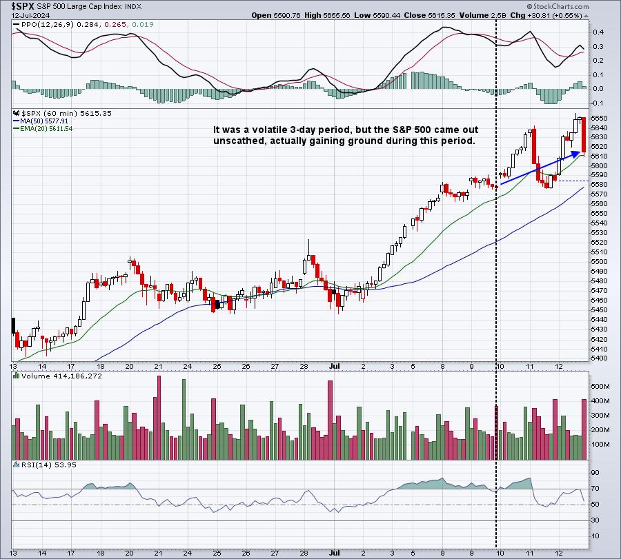 This chart is tracking the relative rotation of these 10 growth stocks (vs. the benchmark S&P 500) over the last 20 periods, or roughly 3 days. Many of these stocks started their 3-day journey on the right side of this chart, which highlights tremendous relative strength at that time. But look where they finished on Friday. Not one of these 10 stocks finished in the leading quadrant. Not one. AAPL held up best, but TSLA, META, and COST tumbled to close out the week. That type of behavior among these growth juggernauts would likely send you to the conclusion that we had 3 really bad days in the market. Instead, look at how the S&P 500 performed over the past 3 days from this hourly chart:
