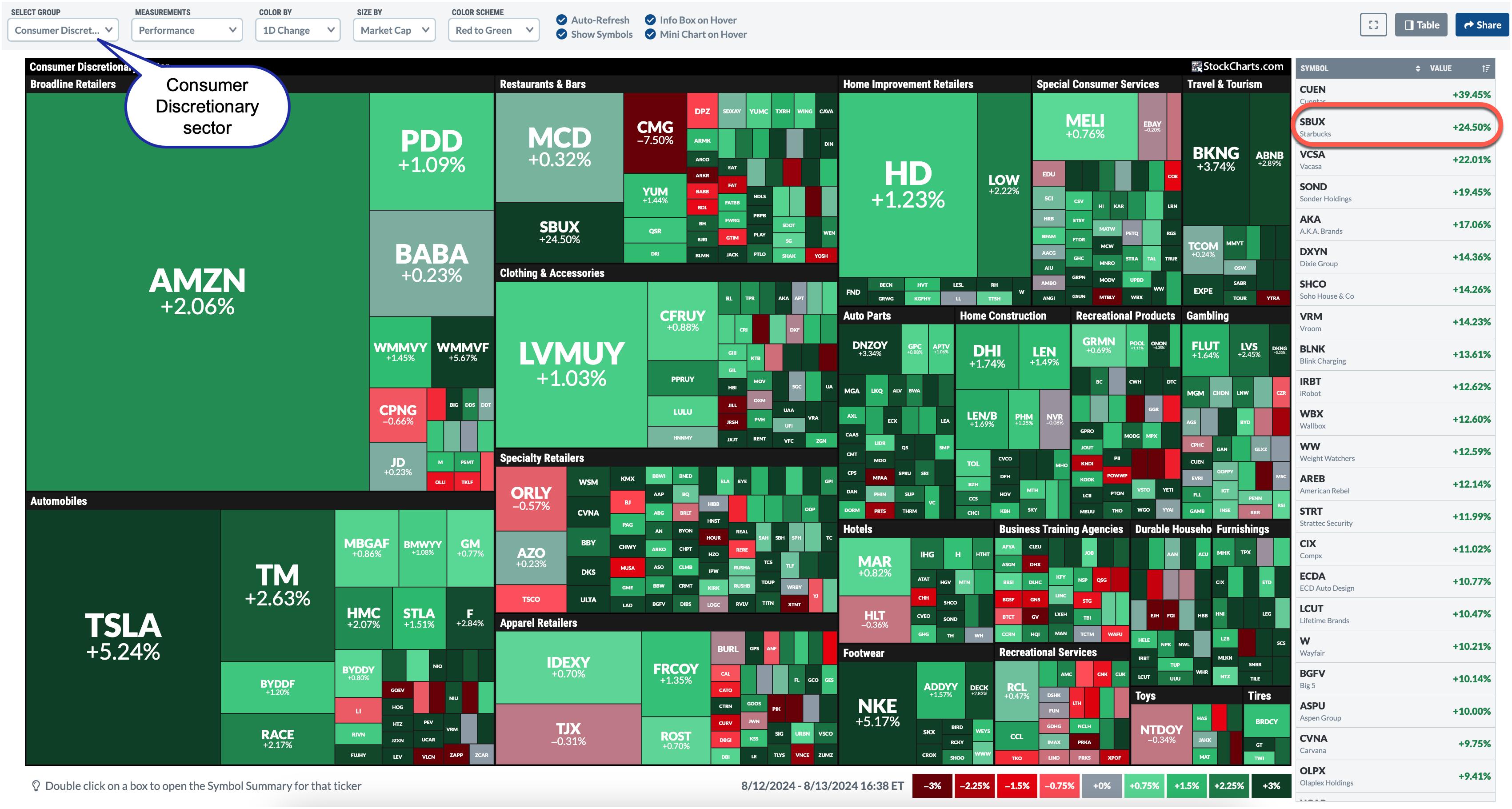 SBUX jumped from an ultra-bearish 10 to a bullish 78.5 (this figure will fluctuate slightly as the price changes throughout the day). At this stage, it’s worth a sector check. A glance at the MarketCarpet for the Consumer Discretionary sector shows how SBUX compares to other Consumer Discretionary stocks.