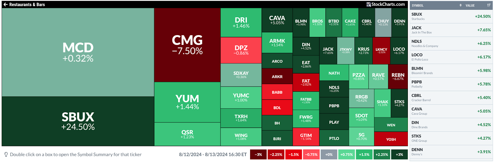 SBUX stands out with a price jump of 24.50%. To compare the stock’s performance to other stocks within its industry group, click the industry group, in this case, Restaurants & Bars (see below).