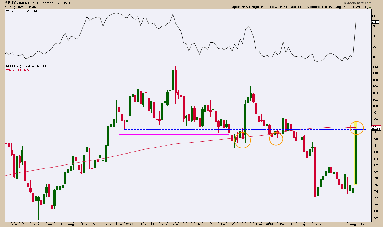 If you checked the StockChartsTechnical Rank (SCTR) report on Tuesday morning, you might have seen the massive spike in Starbucks’ (SBUX) change in value of +62.3. It occupied the highest “Top Up” spot for the Large-Cap stocks category.