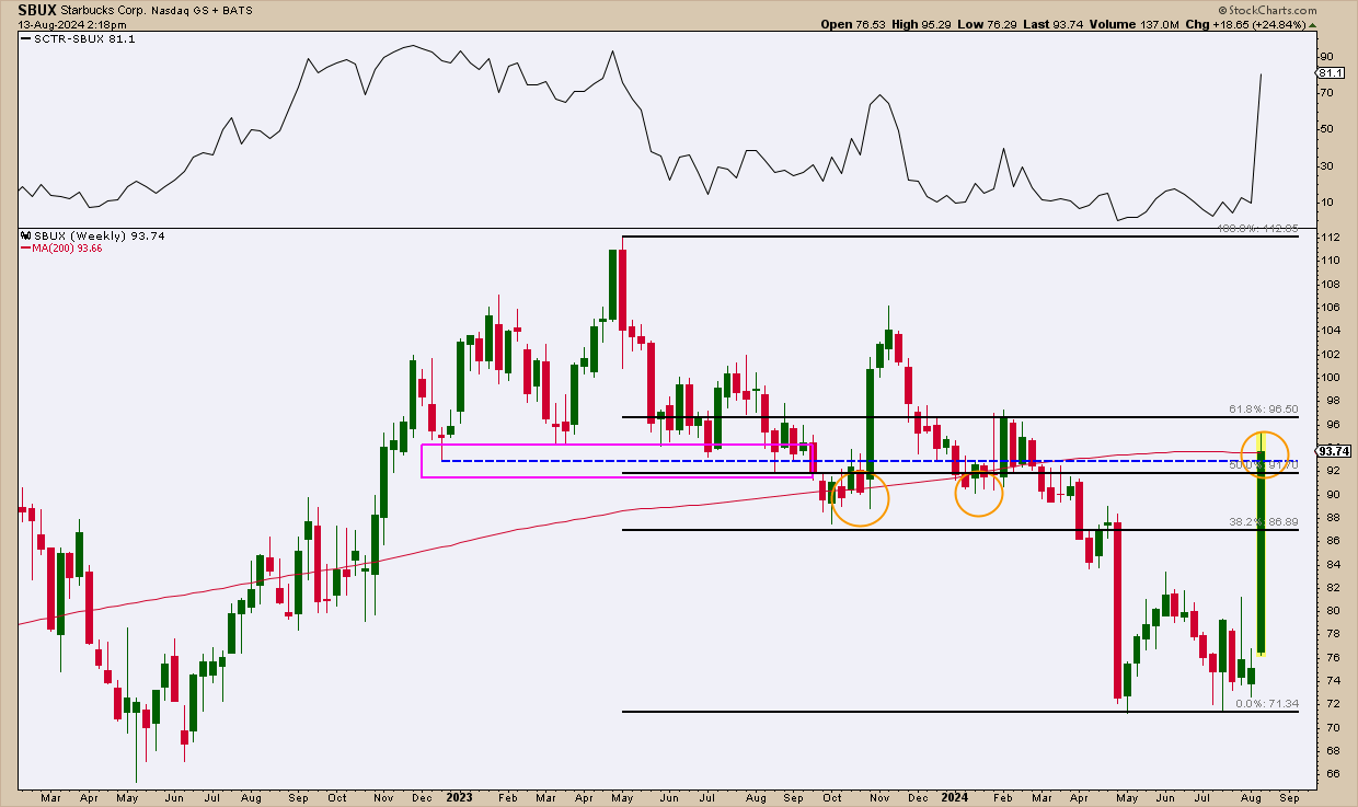 Start with a macro view by looking at the weekly chart of SBUX.