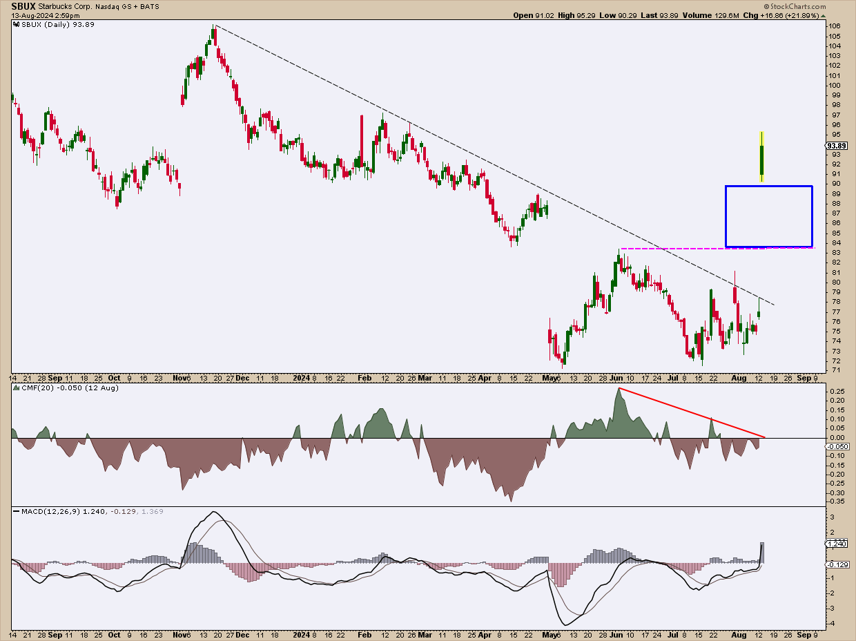 CHART 3. DAILY CHART OF STARBUCKS. Mind the gap. It could be a breakaway gap.Chart source: StockCharts.com. For educational purposes.
