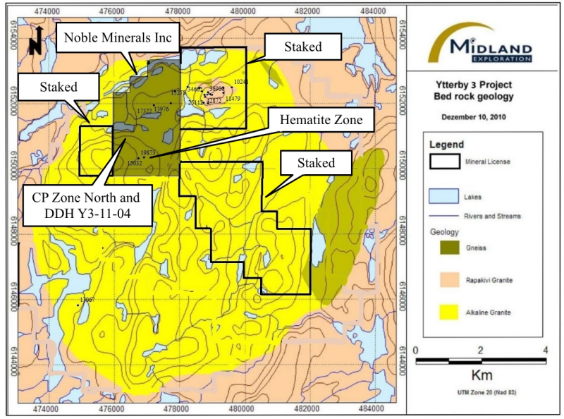 On the property recently staked by Noble, six grab samples greater than 0.5% TREO were located by Midland.  They ranged from 1.40 to 3.02% TREO with: