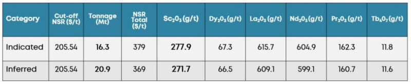 Chart 1: Defined Resource at the Crater Lake Project owned by Scandium Canada.  Source: NI 43-101 Technical Report and Updated Mineral Resource Estimate for the Crater Lake Project, Quebec, Canada: Marina Lund, P.Geo., M.Sc., Simon Boudreau, P.Eng., Marc R. Beauvais, P.Eng: 2025