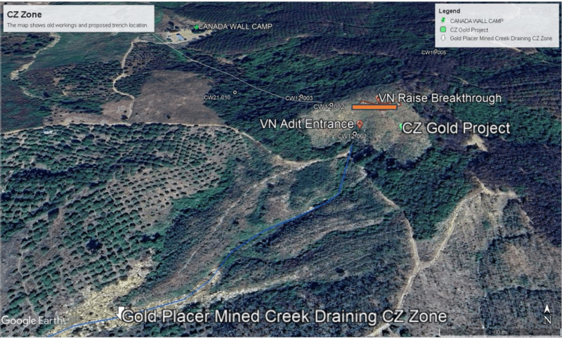The CZ Gold Prospect announced previously – (see Angkor Resources IDENTIFIES GOLD PROSPECT ON ANDONG MEAS LICENSE, CAMBODIA – Angkor Resources Corp.), sits atop a steep hill that has a 47-metre underground incline from the exit to the entrance, with multiple shallow channel samples from underground workings of artisanal miners. The creek directly below the area, described on the map below as ‘Gold Placer-Mined Creek Draining CZ Zone’, has been mined over the past rainy season and panned for 150 metres along both sides of the stream, creating a landscape of pits and piles in the creek bed draining away from CZ Gold.