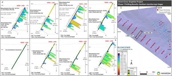 Figures 1-2: Iyan Deposit drill sections showing thick, continuous graphite mineralisation remaining open at depth, remaining sections 1-5, 7, and 9