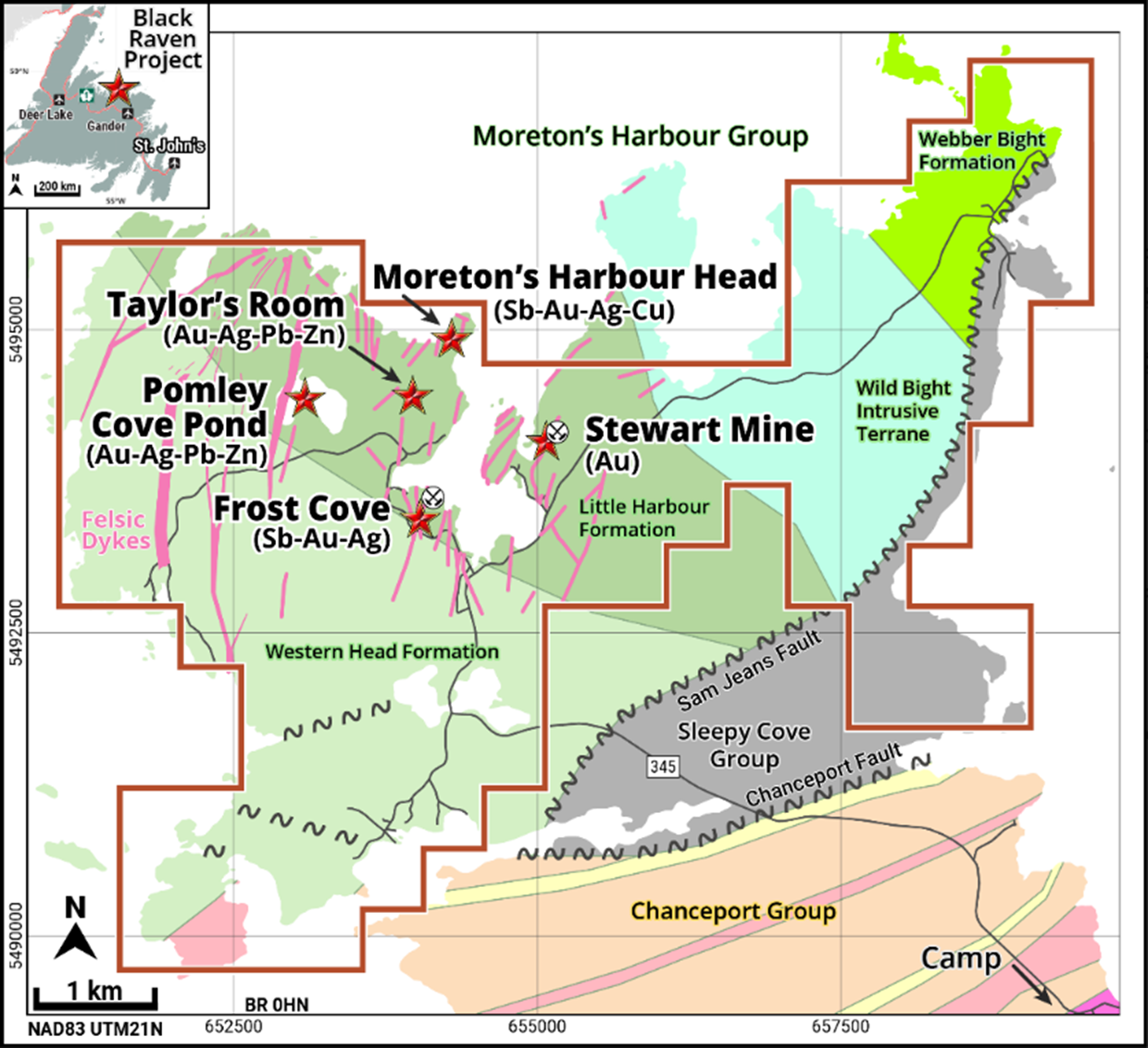 The discoveries reported here are from Churchill’s Fall 2025 exploration program at its Black Raven Project which was designed to evaluate the historic Frost Cove Mine structure for antimony, and explore the potential for broader polymetallic mineralization, including gold, silver, lead, zinc and molybendum through the Property. The program consisted of 50 diamond drillholes, with a cumulative depth of 5,176m, along with extensive channel and soil sampling. This news release provides results for the two Pomley Cove Pond drillholes, with 32 drill holes to be reported, including 12 holes at Taylor’s Room and 14 at Frost Cove. Remaining samples are all at the laboratories and are expected imminently for Frost Cove, then Taylor’s Room, and finally, results from the six holes at the Stewart Mine.