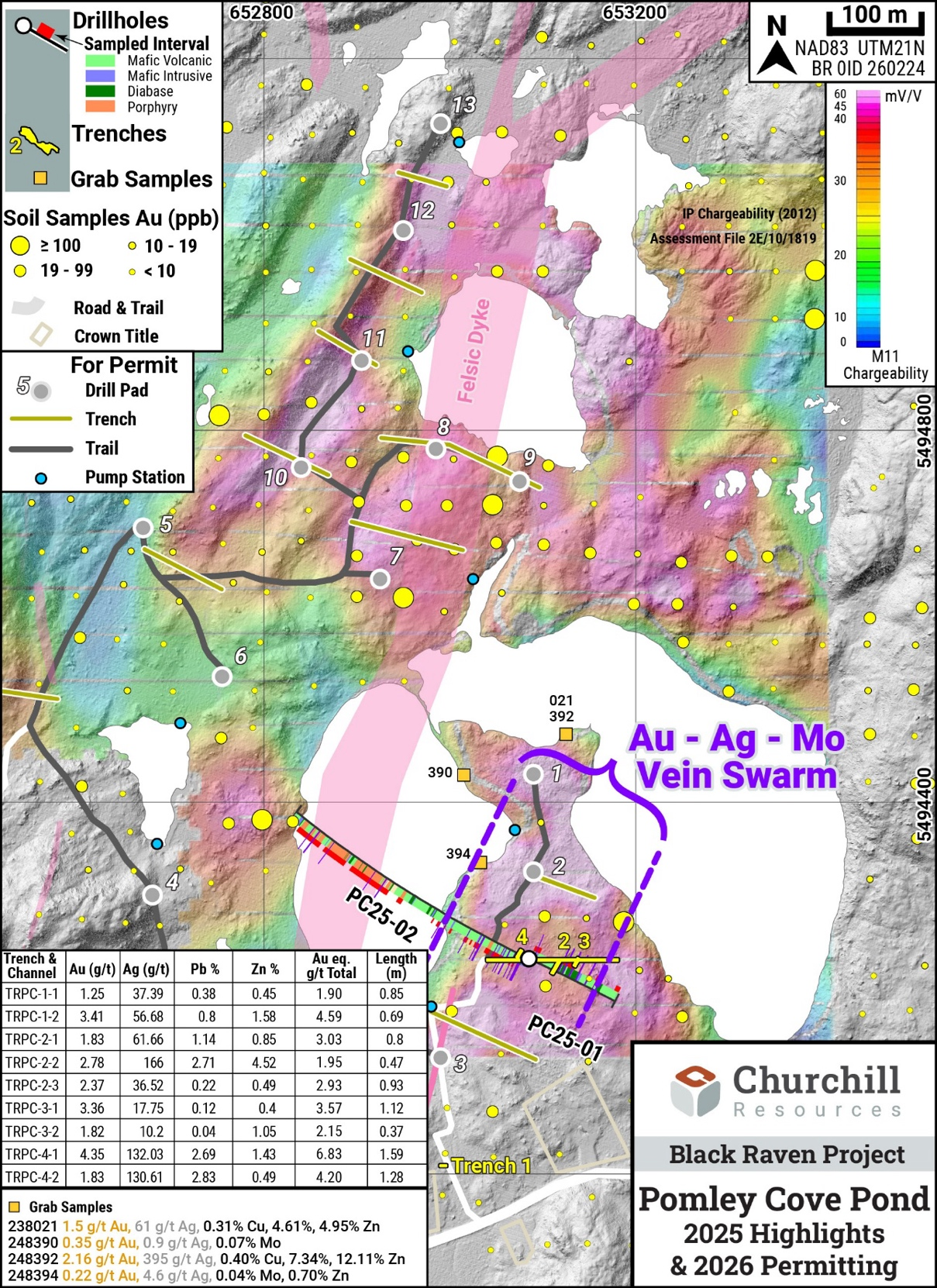 Churchill President Paul Sobie stated: ‘Pomley Cove Pond is a significant emerging focus for Churchill at Black Raven, and these results further underpin our interpretation that the Black Raven Property may be a central locus to a large-scale polymetallic system with multiple mineralized fluid pulses. Pomley Cove exhibits strong silicification associated with disseminated and vein mineralization within an area characterized by a historic IP survey chargeability high. This historic chargeability high represents one small portion of a larger 800m x1200m area with multiple similar IP features. Additionally, our soil sampling in 2025 returned strongly anomalous results for gold, silver, molybdenum, and arsenic in the Pomley Cove Pond area, particularly to the north of the pond, where we plan to commence drilling and trenching in late March (Figures 2 and 3). Initially we will lengthen both holes PC25-01 and 02 as they did not completely test their targeted IP chargeability anomalies due to the Christmas temporary halt to operations, then move on to digging trenches and the drilling of other compelling IP/soil targets, upon receiving permit approvals for the applications submitted for that work.