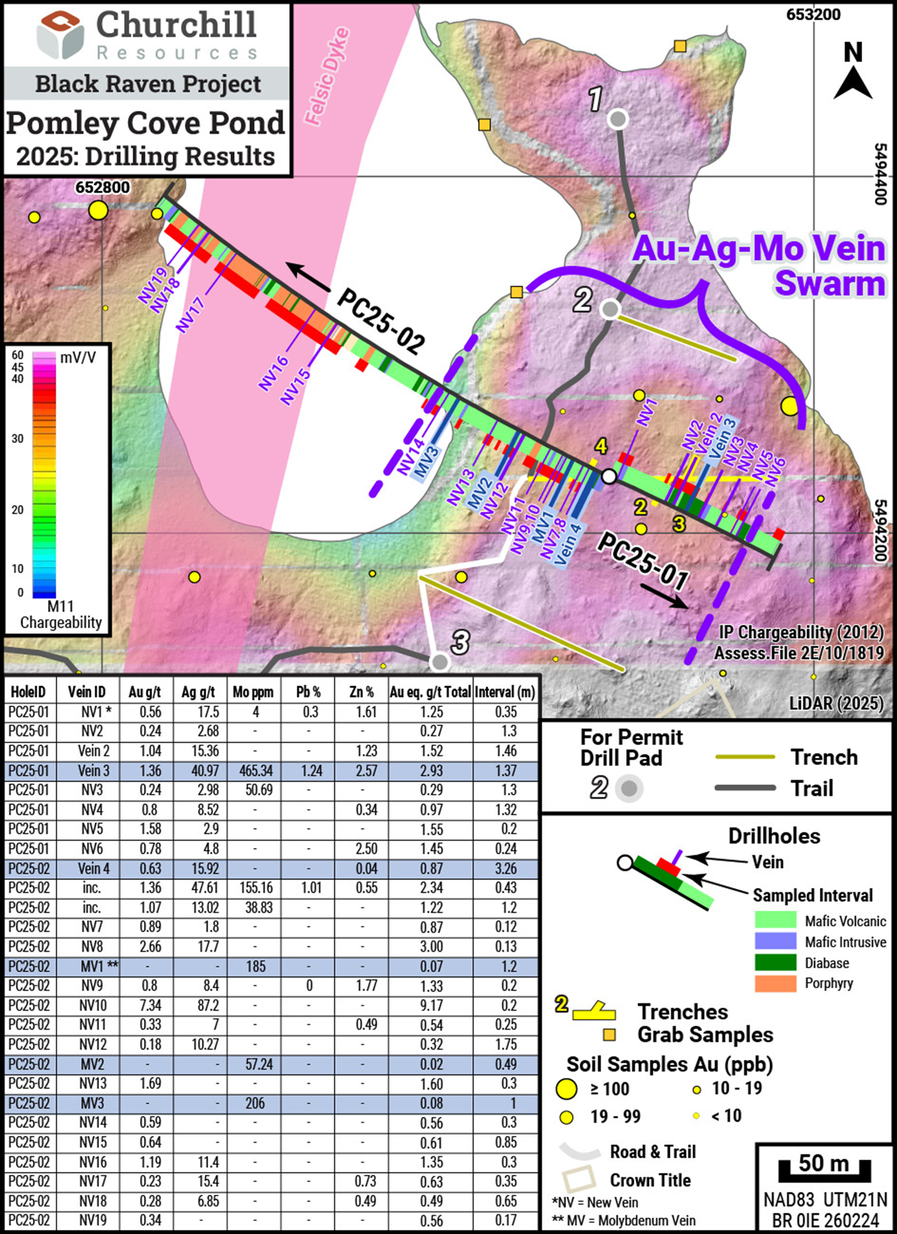 Churchill Resources Inc. (‘Churchill’ or the ‘Company’) (TSXV:CRI.V) is pleased to report drilling intercepts revealing an extensive, polymetallic vein swarm hosting gold, silver, lead, zinc and molybdenum at Pomley Cove Pond, a gold-silver system that the Company discovered at its Black Raven Project in Central Newfoundland. Drill holes PC25-01 and PC25-02, the initial ‘wildcat’ holes drilled in closing days of Churchill’s 2025 winter exploration program, both intersected portions of the swarm and together at least 20 different veins, within a broader 150m wide zone. Individual intercepts include: