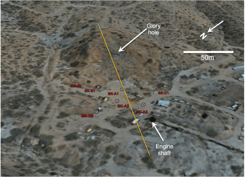 Fig. 1.  Permitted drill sites planned for initial Phase I drilling at the Silver King mine shown by white dots.  The orange line indicates the approximate location of the cross section in Fig. 2.  View looking south-easterly.