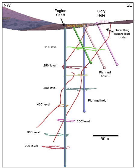 • 1,000 meters of diamond drilling to test the upper portion of the steeply plunging, pipe-like Silver King mineralized body